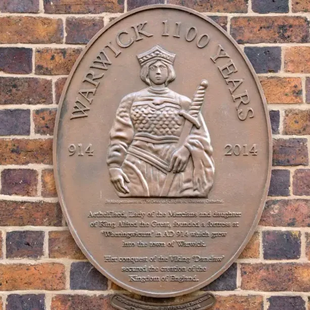 Centre: A plaque commemorating the founding of Warwick by Aetheflaed in AD 914. © Kevin George / Alamy Stock Photo.
